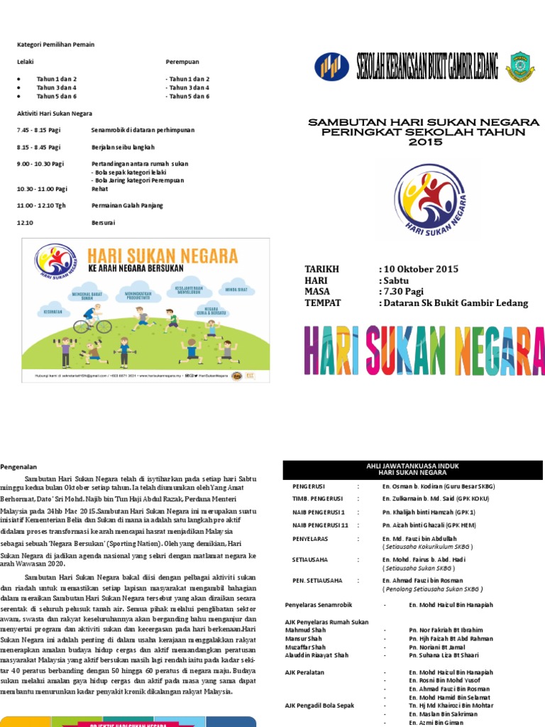Hari sukan آ hari sukan negara 2015 jabatan pendidikan negeri perak a. Tapak perhimpunan, sk tangga batu. Glendora devero 13 january 2015. Zul kamaruddin 11 october 2015. Sambutan hari sukan negara 2017 telah di isytiharkan pada setiap hari sabtu minggu kedua bulan oktober setiap tahun.